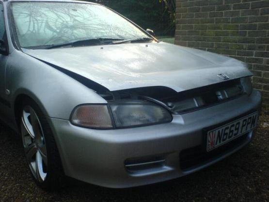 So while we were waiting for him to arrive we thought we would go to the service station in her civic and get some food from Burger king... Then on the way out the services we saw Adzs12 in his silvia go past towards Haywards Heath. (car looked stunning) So we thought sweet lets chase him and flag him down for a chat..... we got up to around 70mph and we could see him in front but was about 250mtrs away. Then SUDDENLY BANG!!!!!!!!. Claires bonnet catch let go flew up and smashed her windscreen to pieces and bent the bonnet like a crisp packet.... She slowed down surpirisingly well and controlled and i pulled the bonnet down off the windscreen. Adz had not known we were there behind him so this is probs the first he will hear about it...... Then Dr silvia(ant) turned up and we fitted the alternator and tied her bonnet down with wire and crawled back to mine. Weve found another bonnet at the breakers yard in blue and fitted it,it needs spraying yet but the bodyshops booked up for the next 4 weeks so we will have it done then, the windscreen guy is fitting the screen on Monday.... Grim evening, Thanks Ant for your help that night by the way.....
